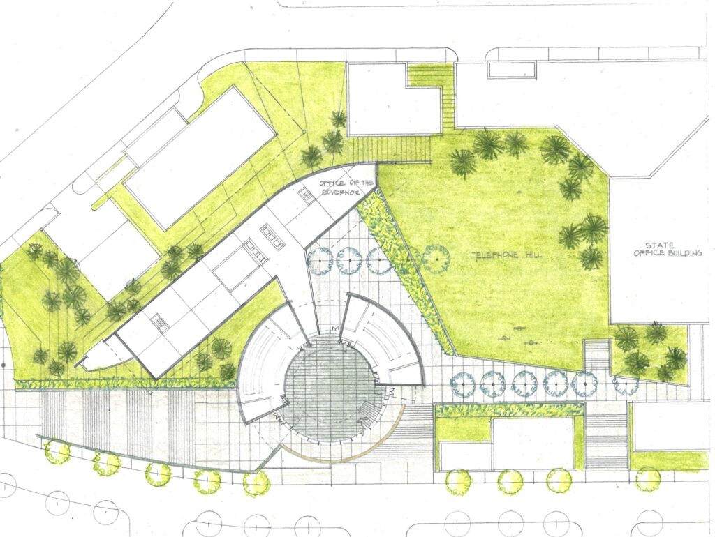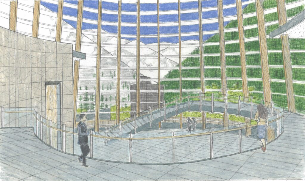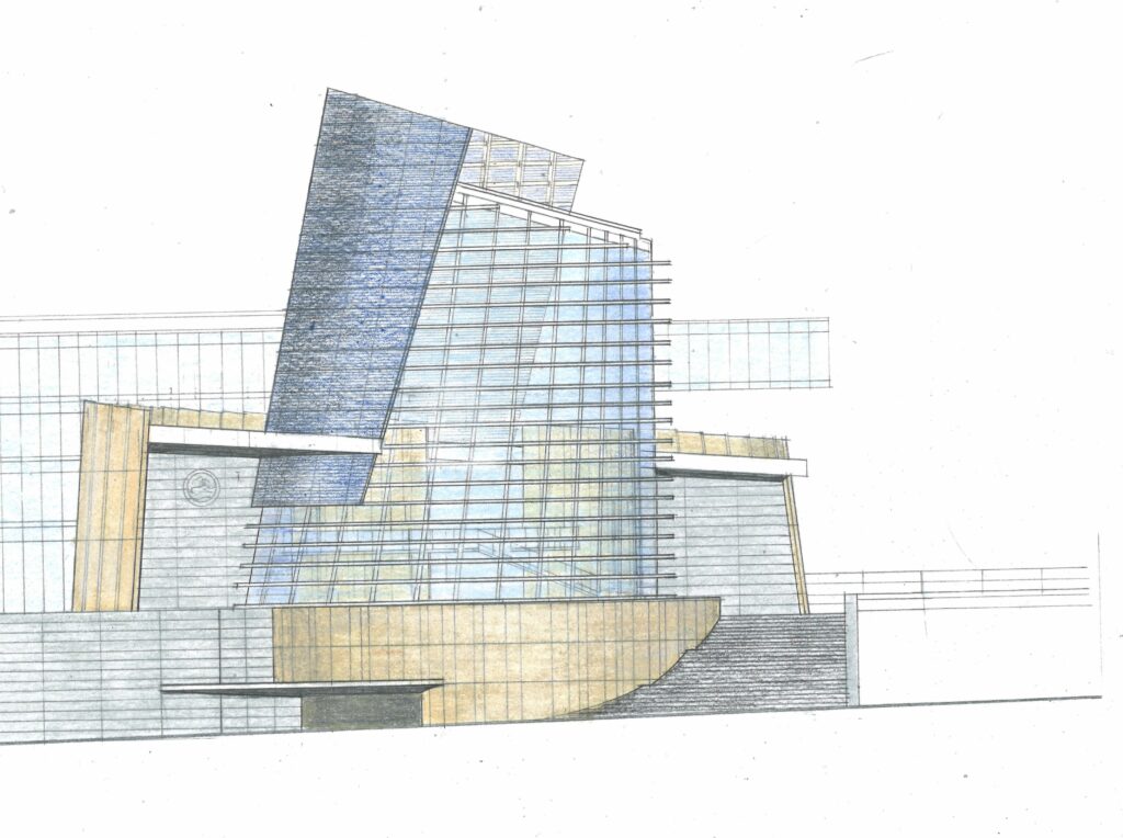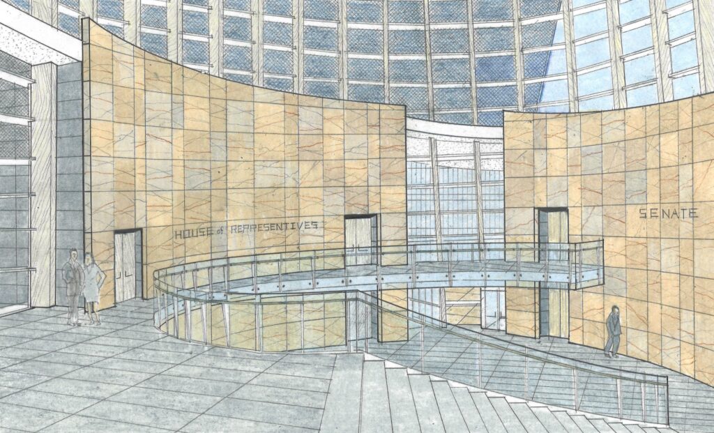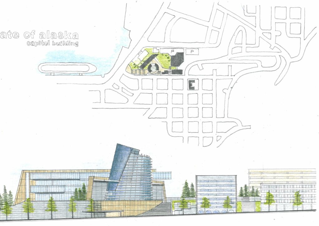 alaska has made several attempts to build a capitol building, at one point looking at building an entirely new city closer to the population center of the state. juneau is isolated and cannot be reached by automobile but has a spectacular setting. juneau held an invited design competition for a capitol building. the state is still using the territorial capitol. the results of the design competition were met with strong opposition because they were too avante garde. none of the entries took advantage of the spectacular site so mr. olschlager’s academic study proposed a building with a traditional central rotunda of glass with the two legislative chambers flanking the rotunda.