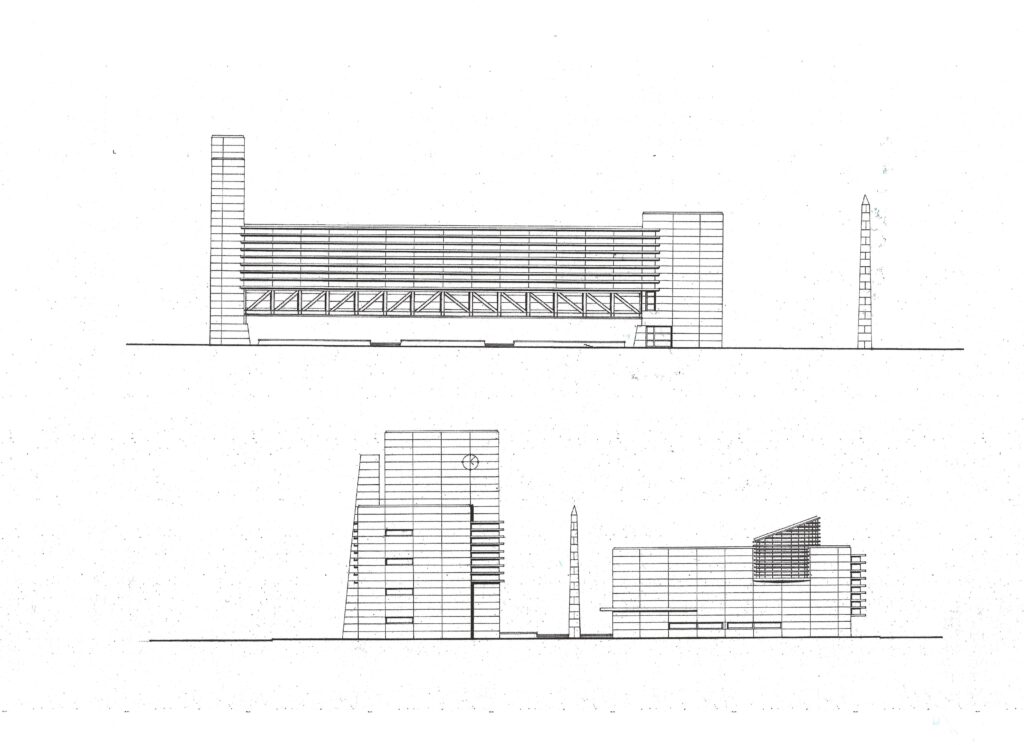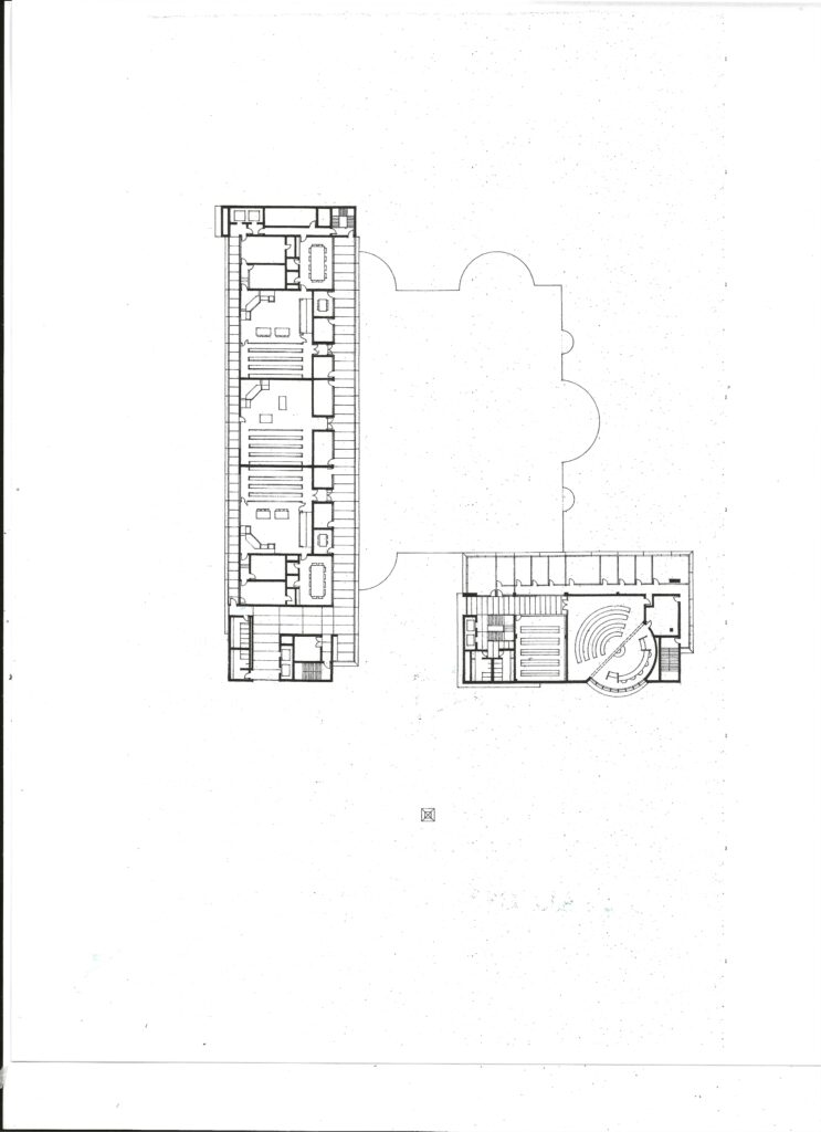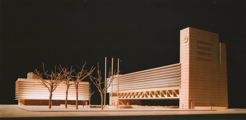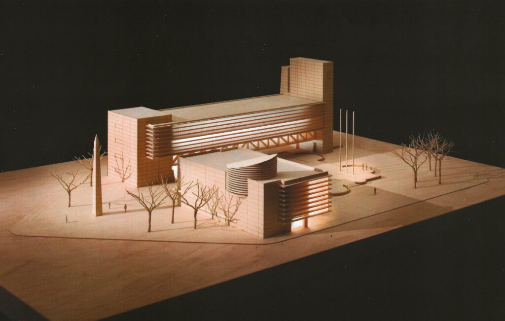 the fennimore county government center project was done in collaboration with mr. olschlager’s college professor ronald ramsey. ramsey created a fictitious town to use as a didactic tool for students to learn about how towns develop and evolve overtime. he invited mr. olschlager to participate in the project. mr. olschlager suggested to do the county courthouse since he had designed a number of them throughout his career. however, professor ramsey had already designed a historic courthouse. mr. olschlager suggested the historic courthouse would burn down in 1962. mr. olschlager’s project would be to replace it with a modern courthouse that would span over the ruins of the historic building.