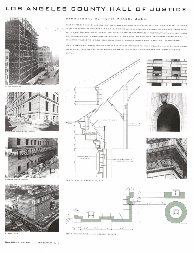 the los angeles hall of justice was damaged in the 1994 northridge earthquake. mr. olschlager was part of a consultant team retained by the county of los angeles as a historic preservation consultant to do a fema damage survey report of the aftermath. mr. olschlager developed a program for repairs to the building’s exterior stone, terra cotta and windows. mr. olschlager developed a program for retention of important interior spaces including the main lobby, corridors, bathrooms, and three historic courtrooms. the remainder of the building interiors underwent adaptive reuse for the county sheriff’s office.